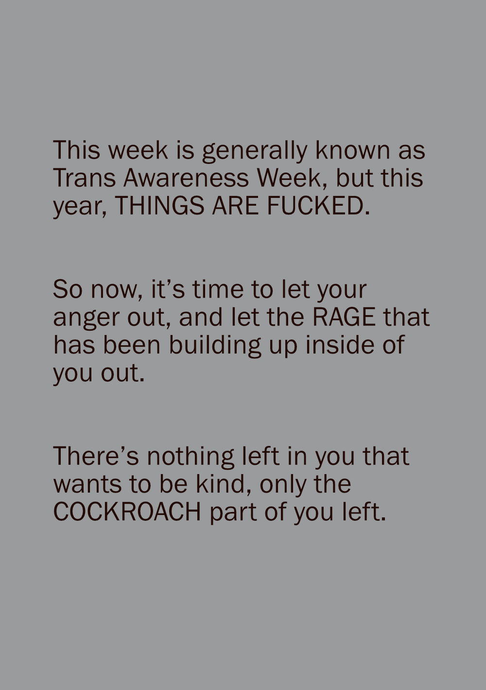 Trans Rage Week is written because being polite has not gotten us far enough. Let's get angry.